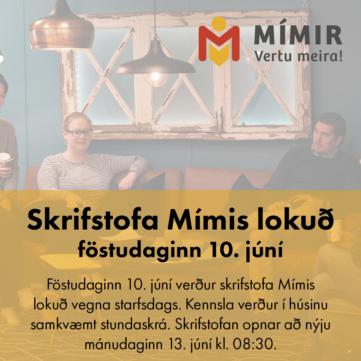 Föstudaginn 10. júní verður skrifstofa Mímis lokuð vegna starfsdags. Kennsla verður í húsinu samkvæmt stundaskrá. Skrifstofan opnar að nýju mánudaginn 13. júní kl. 08:30.