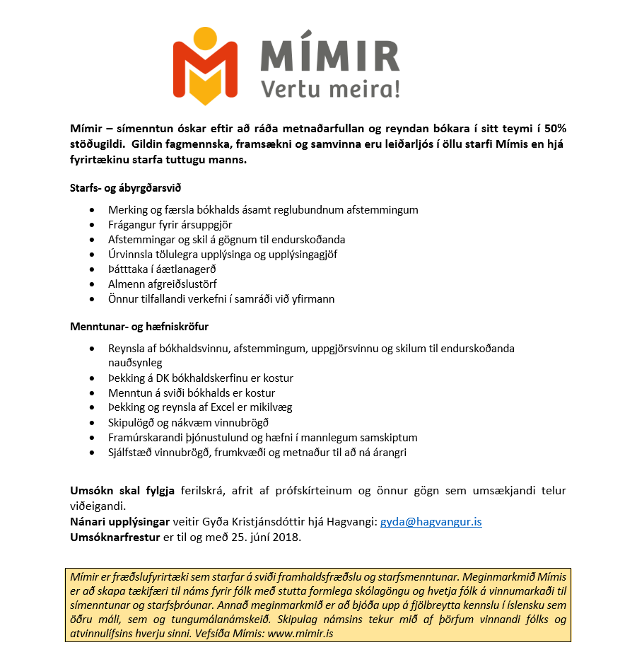 Mímir óskar eftir að ráða metnaðarfullan og reyndan bókara í 50% starf.