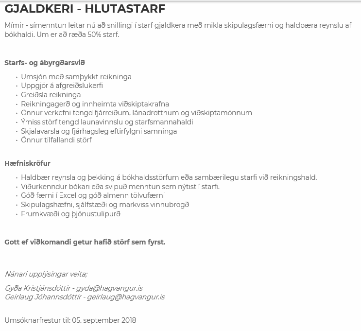 Okkur vantar gjaldkera í 50% starf. Nánari upplýsingar hjá Hagvangi.