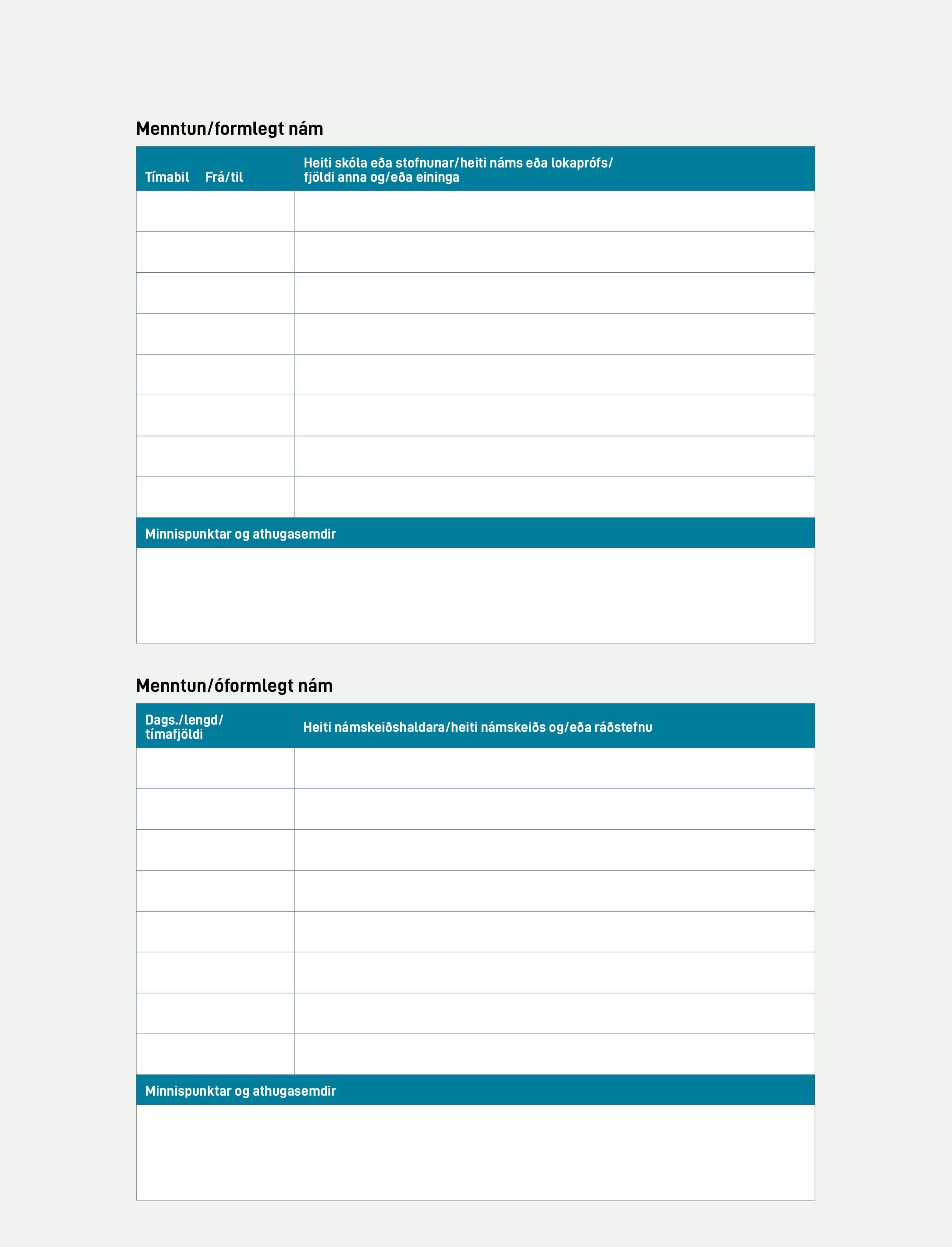 Sé um að ræða löggilt iðnnám erlendis frá má hafa samband við Iðuna fræðslusetur (https://www.idan.is/) með mat á námi og ráðgjöf en við Rafmennt (https://www.rafmennt.is/) vegna rafiðngreina. Til að fá yfirsýn yfir menntun þína er hægt að nota skipulagið hér að neðan:
