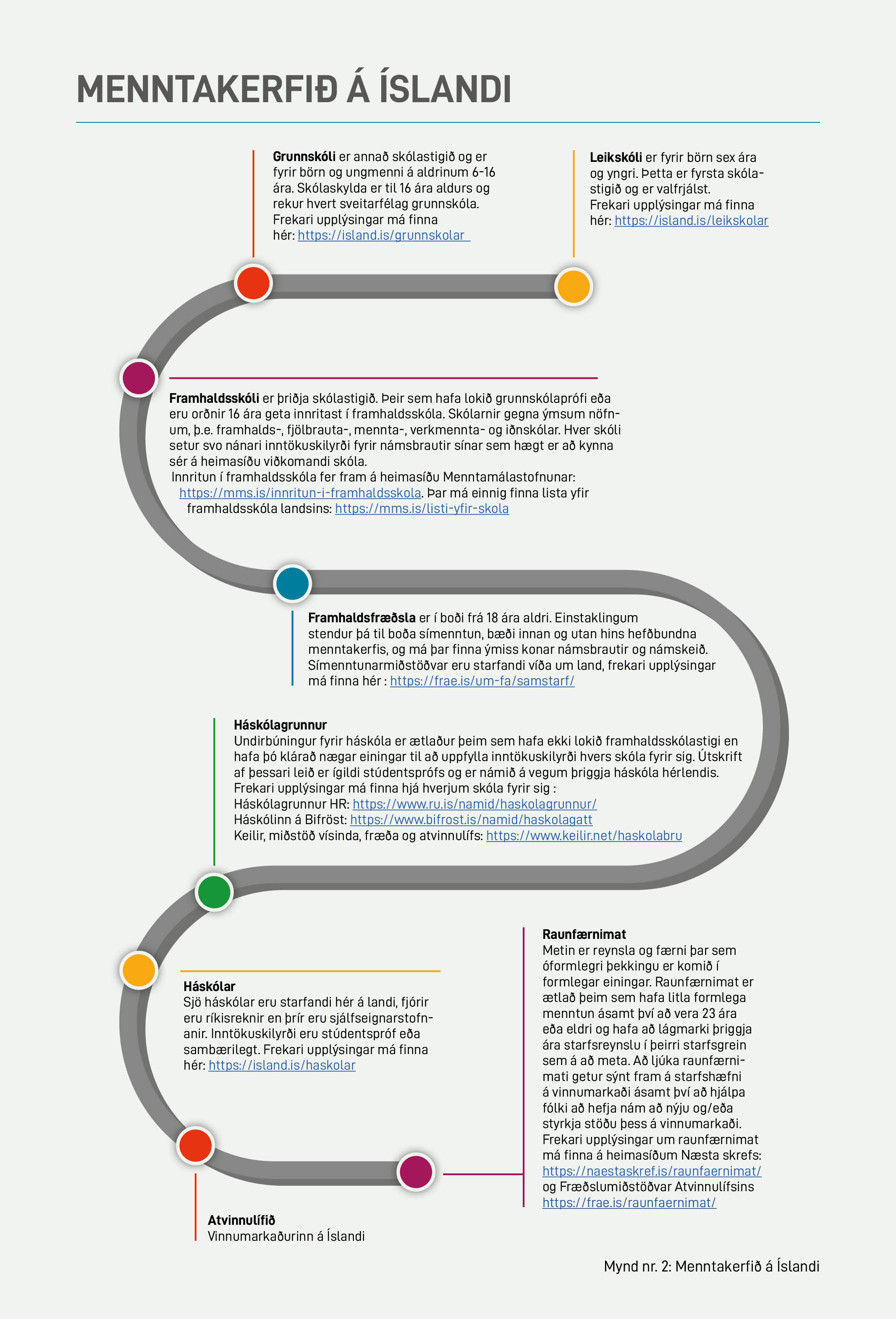 Til þess að átta sig á þeim valmöguleikum sem í boði eru þarf að vita hvar upplýsingar um nám er að finna. Menntakerfið á Íslandi er fjölbreytt og má sjá heildaryfirsýn á mynd 2 hér að neðan. Í kjölfarið má svo finna frekari útskýringar í textaformi.